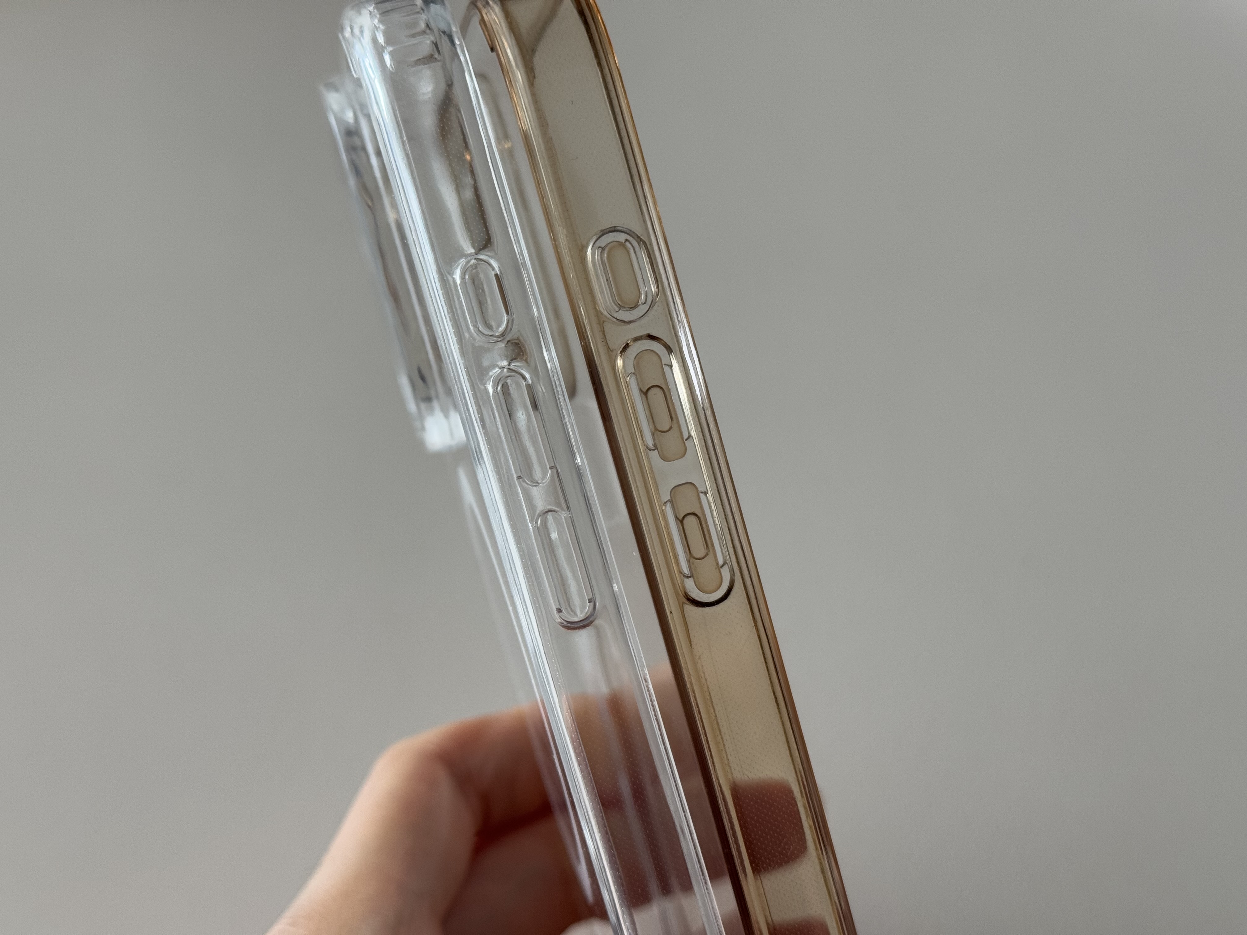 신지모루 케이스는 옆 버튼 쪽이 뚫려있는데 다이소 케이스는 완전 일체형이다.